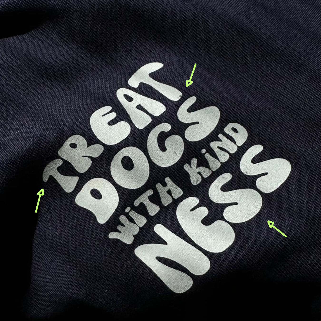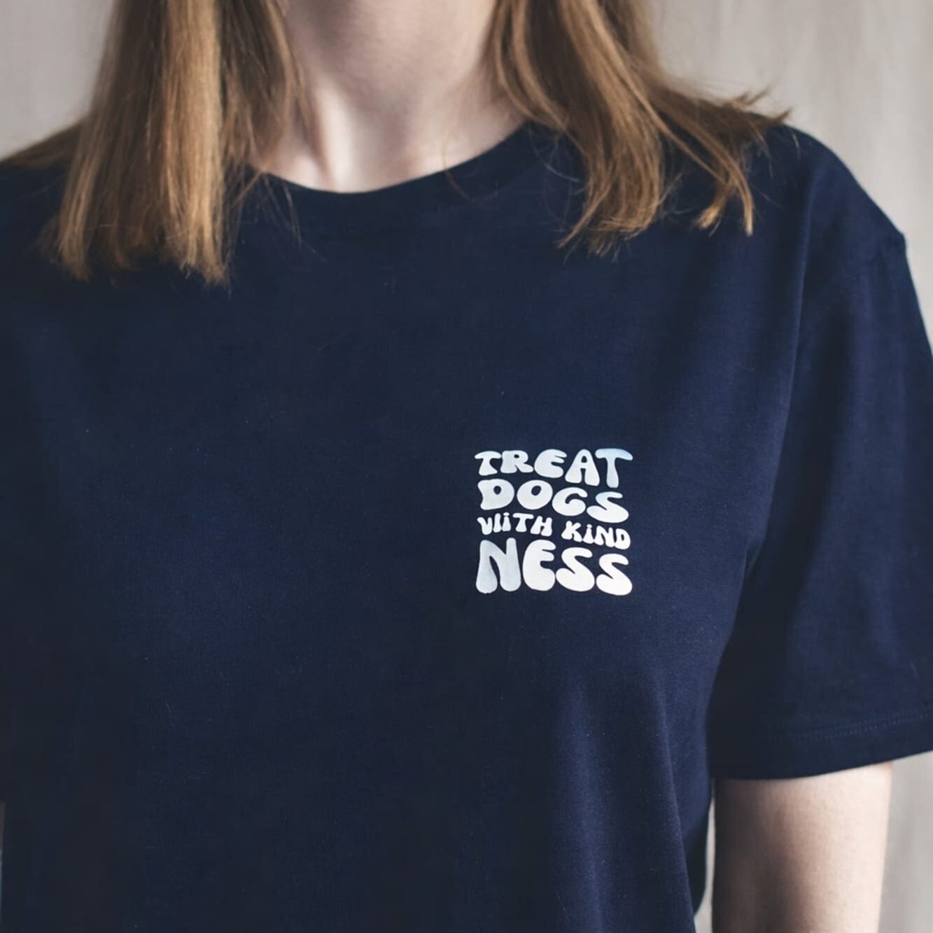 Dieses T-Shirt in Größe S und der Farbkombination Dunkelblau/Weiß steht für einen fairen und respektvollen Umgang mit Hunden. Gefertigt aus 100 % Bio-Baumwolle punktet es mit einem angenehm weichen Tragegefühl. Das Shirt wurde von uns beidseitig bedruckt. Beim vorderen Motiv befindet sich ein kleiner Schönheitsfehler (siehe Bild 2): An ein paar Stellen deckt die Farbe nicht vollständig. Abgesehen davon ist das T-Shirt in einem sehr guten Zustand und bereit, gemeinsam mit dir diese wichtige Botschaft in die Welt zu tragen: Treat Dogs with Kindness.